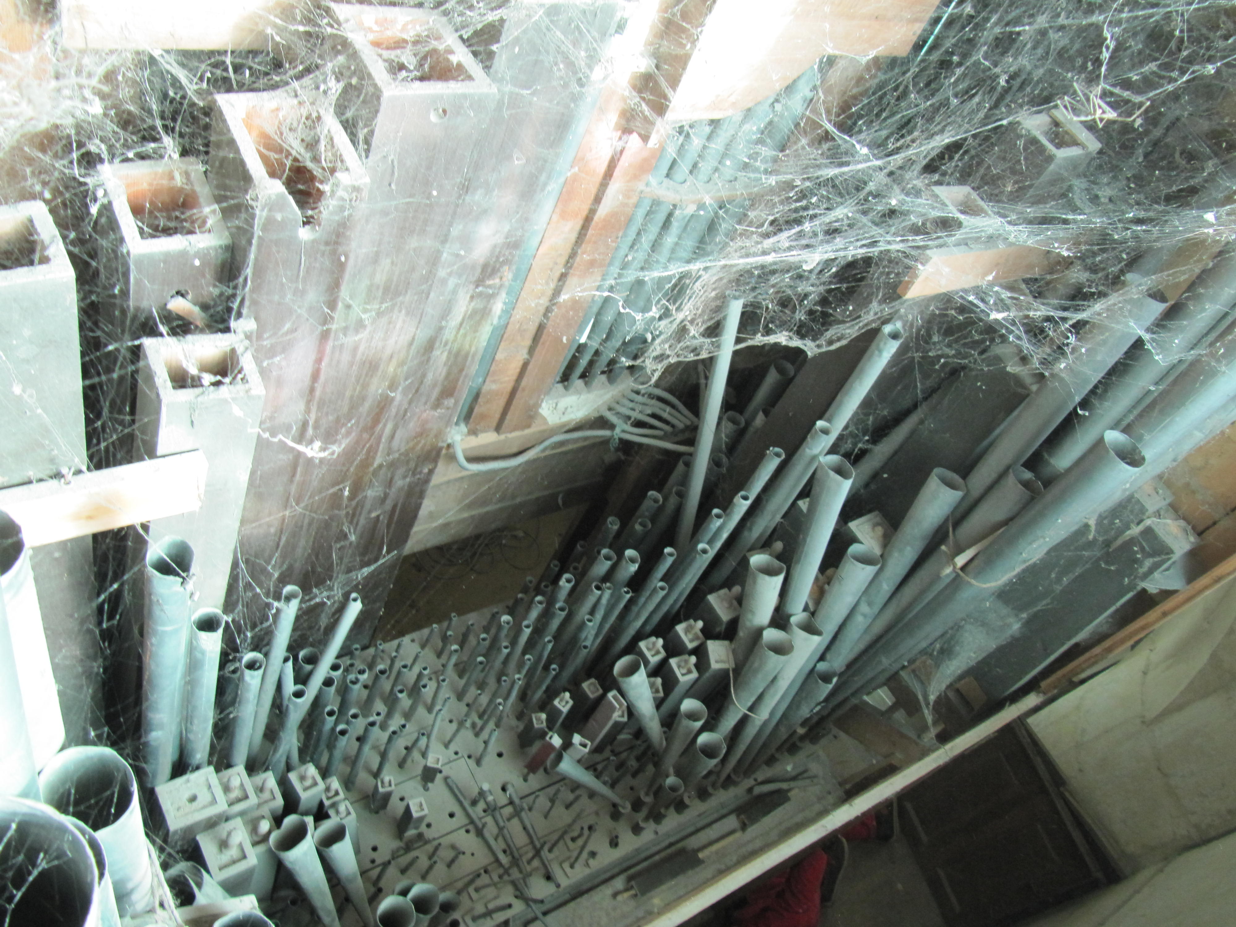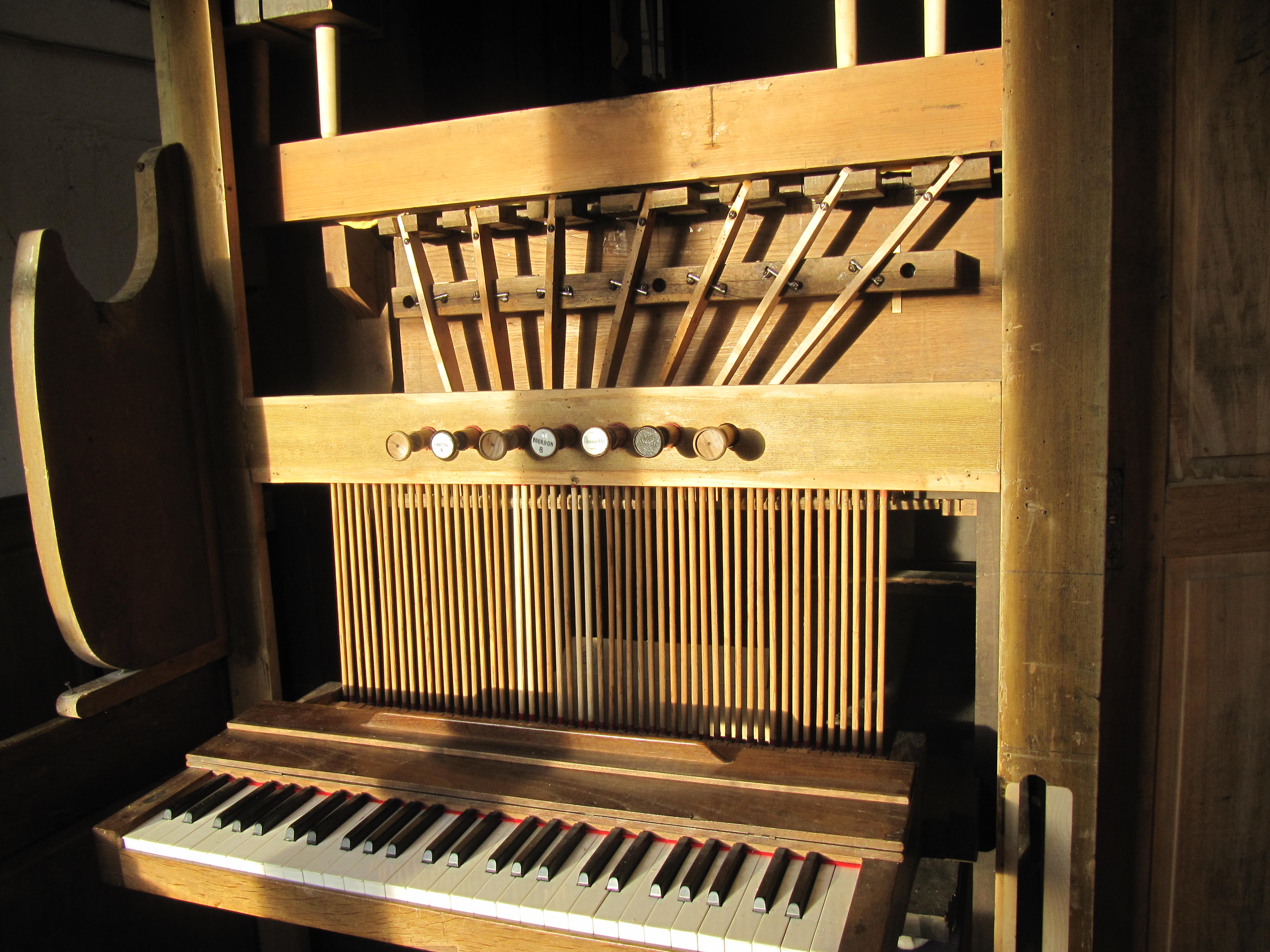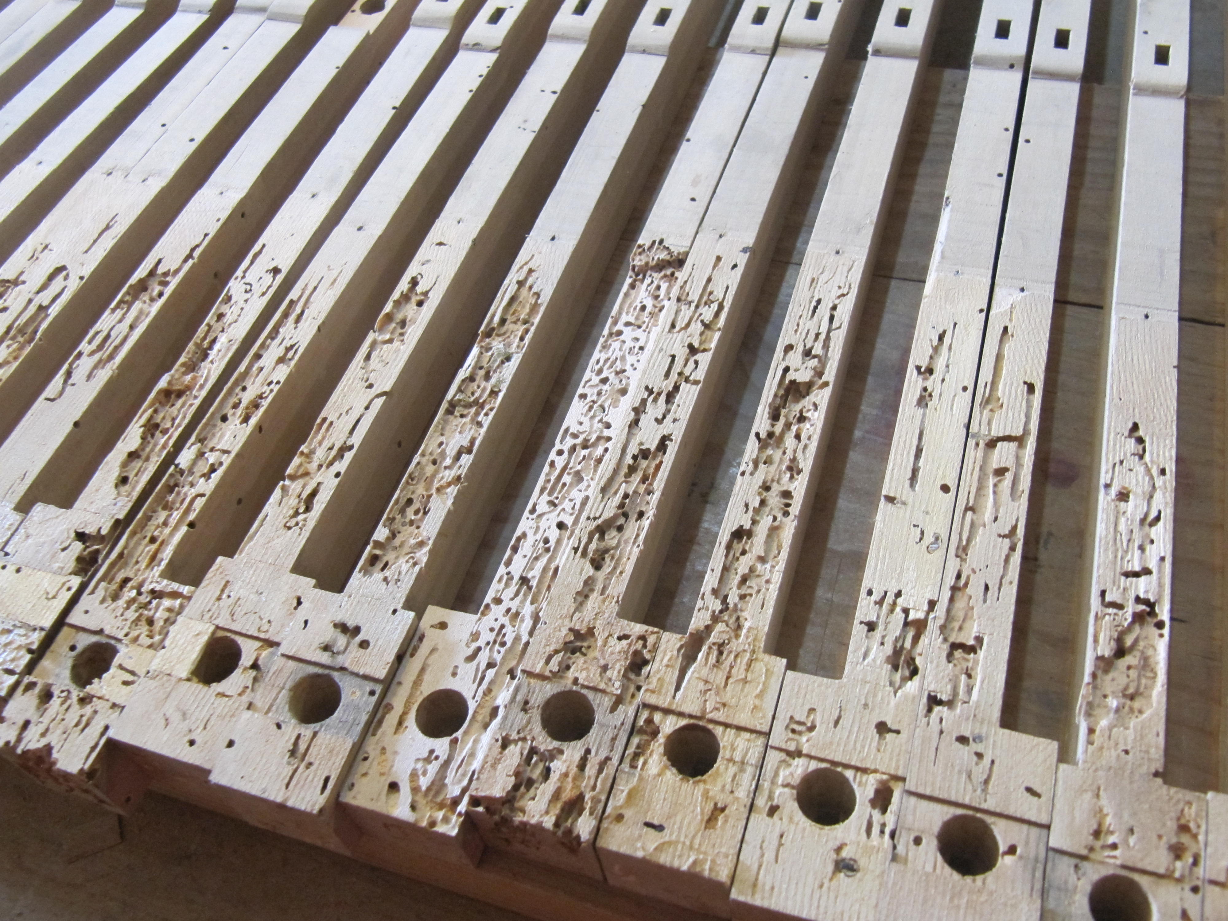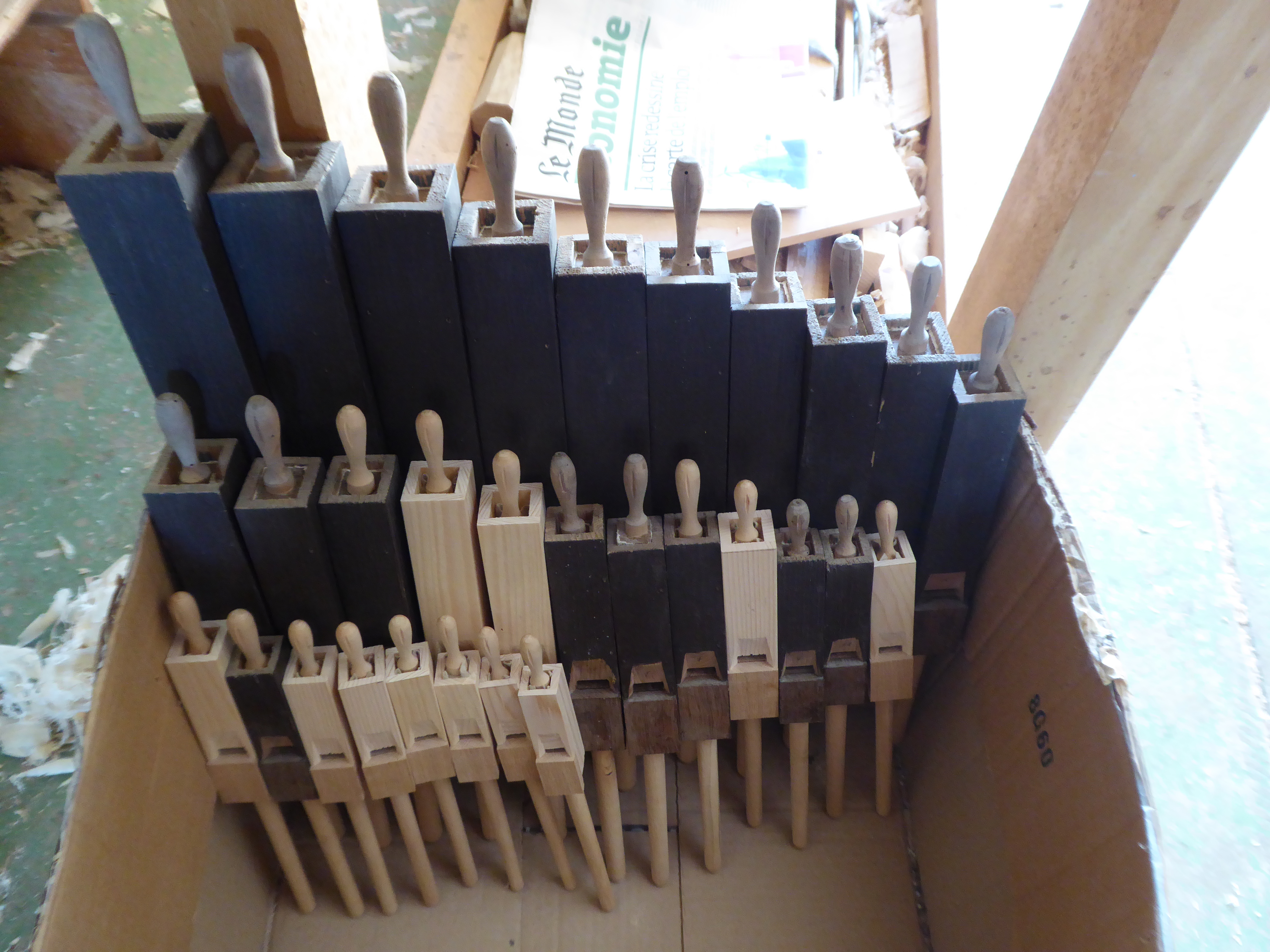 Nous avons donc effectué ici un travail de restauration approfondi sur le buffet, le garde-corps, les sommiers, la soufflerie, la mécanique et l’ensemble de la tuyauterie. De nombreuses pièces de l’orgue en cormier, tilleul, charme ou peuplier étaient particulièrement attaquées par les vers xylophages et ont donc dues être refaites en copie.