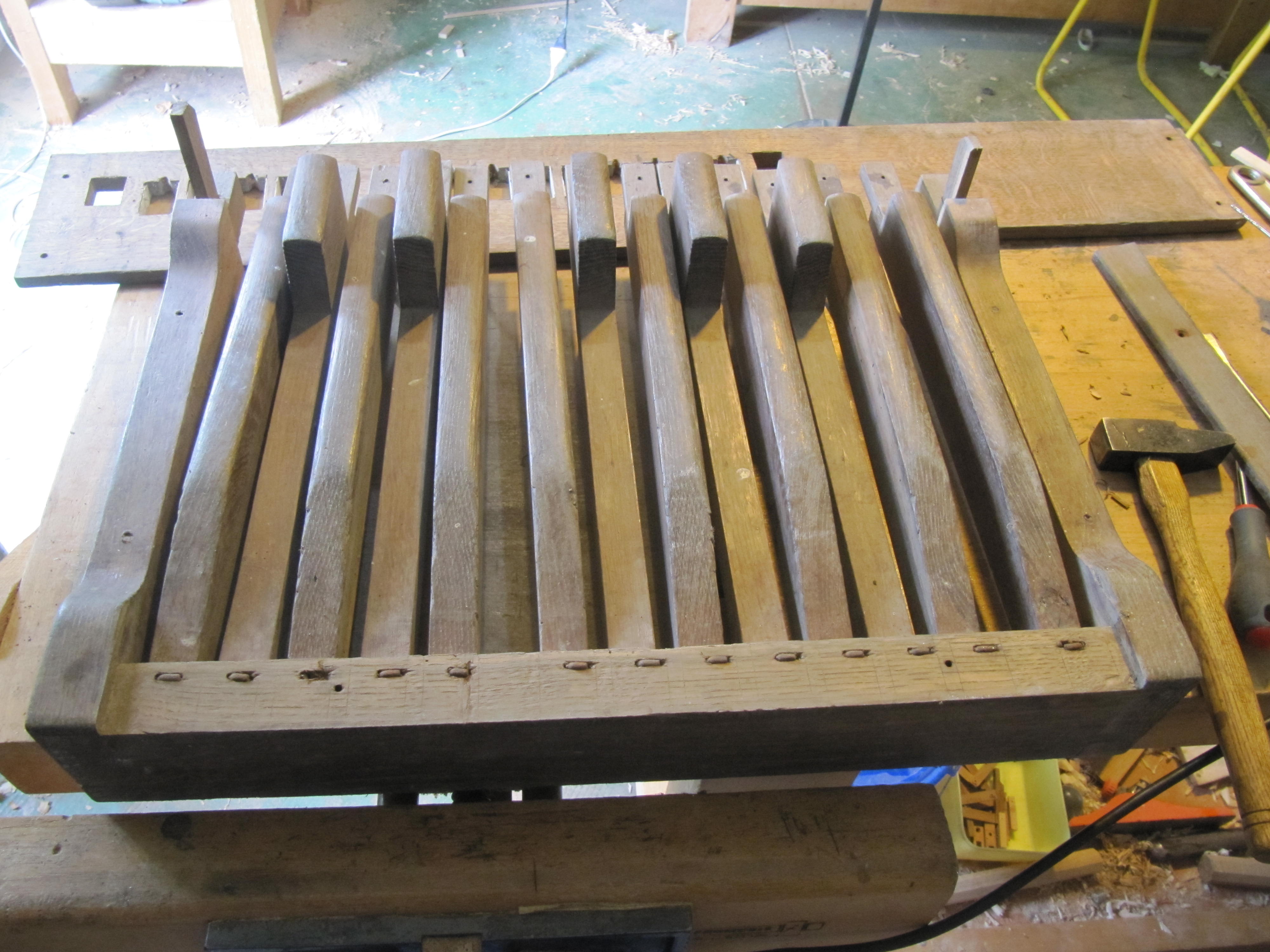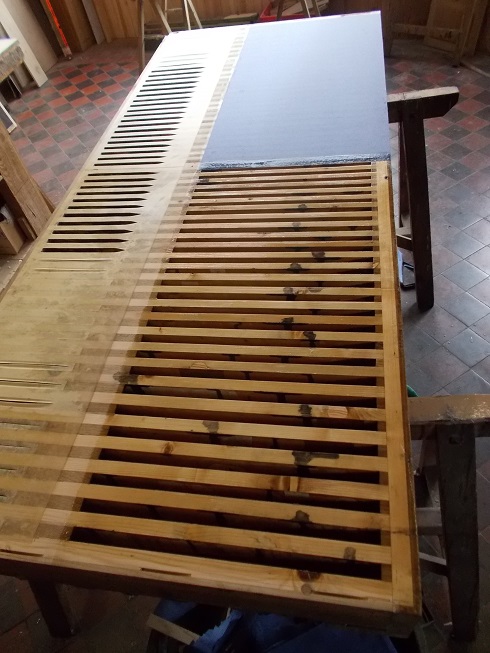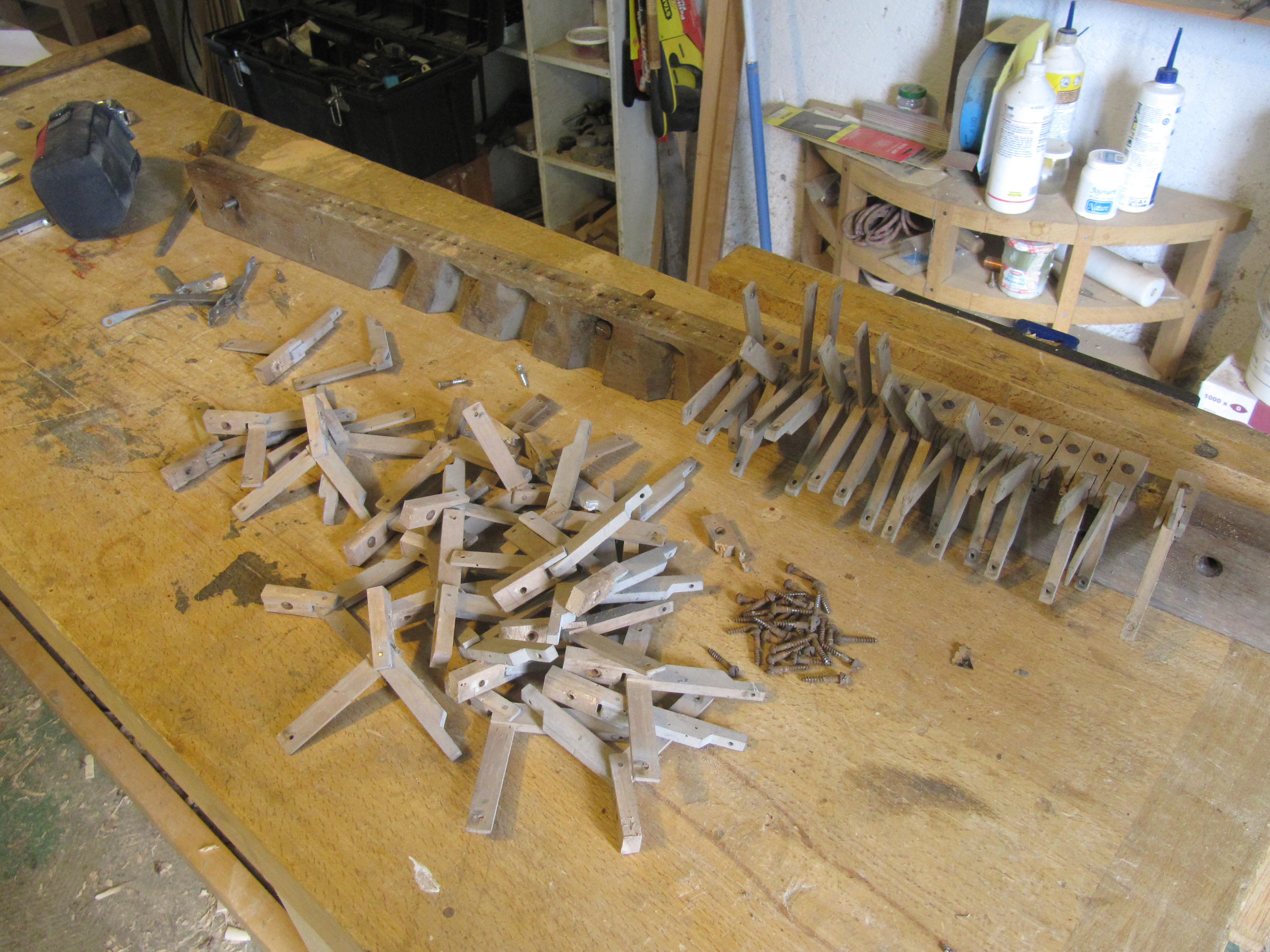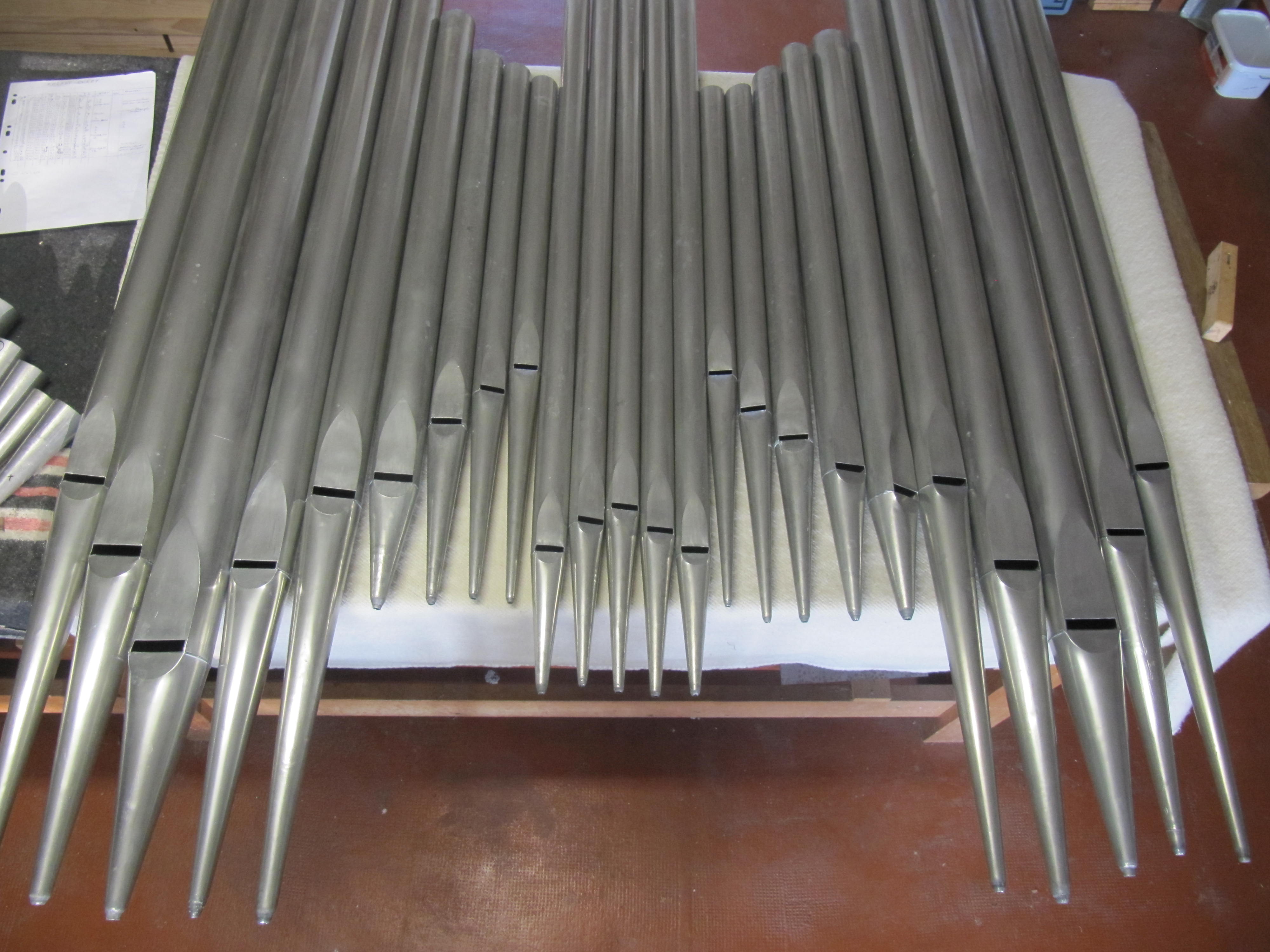 Nous avons donc effectué ici un travail de restauration approfondi sur le buffet, le garde-corps, les sommiers, la soufflerie, la mécanique et l’ensemble de la tuyauterie. De nombreuses pièces de l’orgue en cormier, tilleul, charme ou peuplier étaient particulièrement attaquées par les vers xylophages et ont donc dues être refaites en copie.