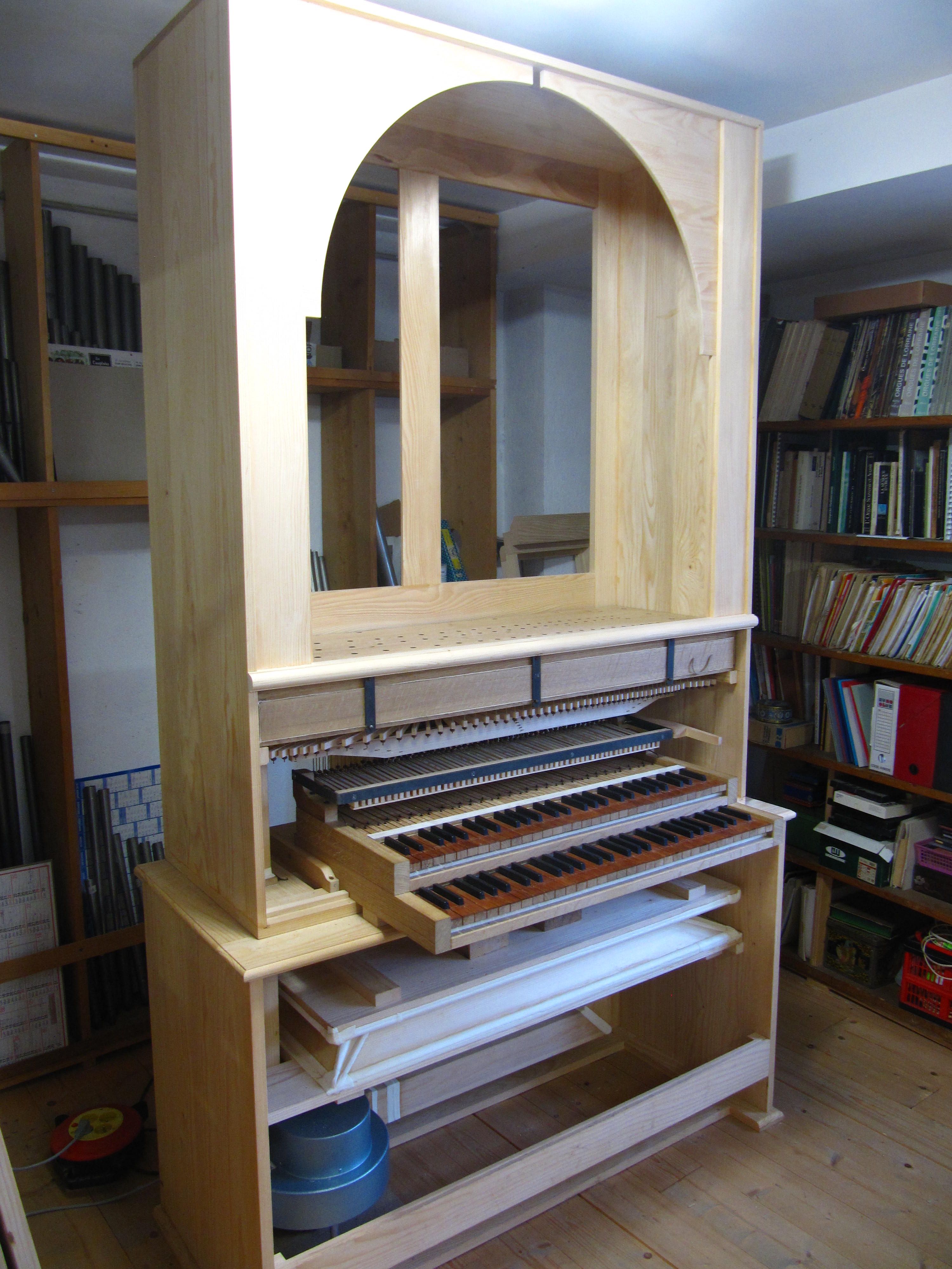 Mécanique à pilotes et balanciers en éventail. Claviers à bascules en épicéa, naturelles plaquées en prunier, feintes en ébène. Deux abrégés de ravalement en fer à l’italienne. Accouplements réversible à fourchettes. Mécanique de tirasses à balanciers. Pédalier droit en chêne.